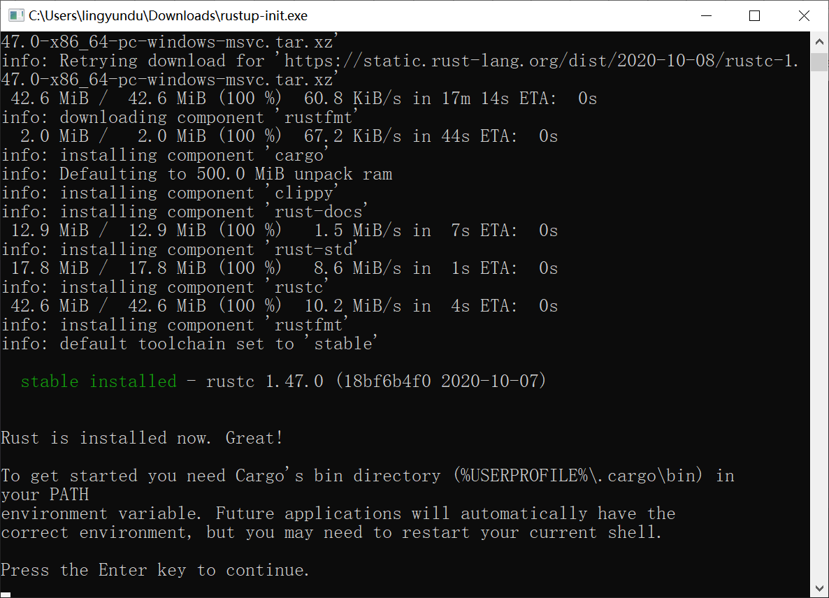 下載RUSTUP-INIT.EXE:https://static.rust-lang.org/rustup/dist/x86_64-pc-windows-msvc/rustup-init.exe