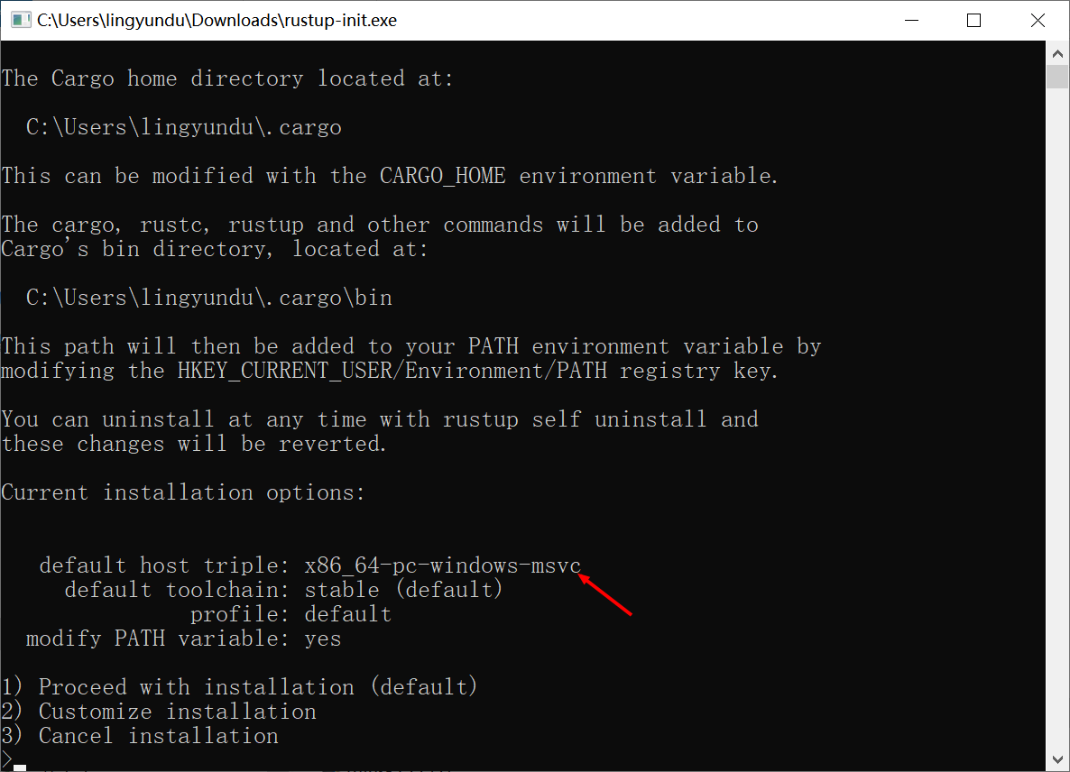雙擊RUSTUP-INIT.EXE,若已經安裝了Microsoft C++ 生成工具,則會展示以下內容。直接敲回車就可以,因為它預設選的 C 語言編譯環境就是 MSVC。