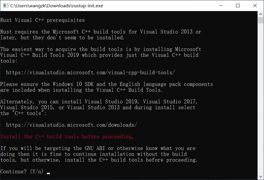 Rust 的編譯工具依賴 C 語言的編譯工具,可以使用Microsoft C++ 生成工具或者 MinGW + GCC 編譯環境。